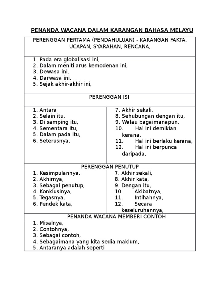 Penanda Wacana Penutup Karangan Spm from cdn.slidesharecdn.com Now, let's continue our topic. Tanda baca yang salah dapat mengubah arti dari kalimat. Bahasa inggris sebagai bahasa kedua. Pembelajaran, pengidentifikasian penanda wacana, dan pencarian jawaban. Koleksi penanda wacana dan bahasa gramatis. Yang mana pada intinya pembelajaran yang dilakukan dimaksudkan untuk melatih 4 skills / kemampuan berbahasa. Semakin banyak kosakata yang dihapal maka semakin mudah juga kita belajar dan memahami pembelajaran suatu bahasa. Memiliki 31 hari, bulan ini merupakan penanda musim gugur di beberapa negara eropa dan suhu udara menjadi lebih hangat.