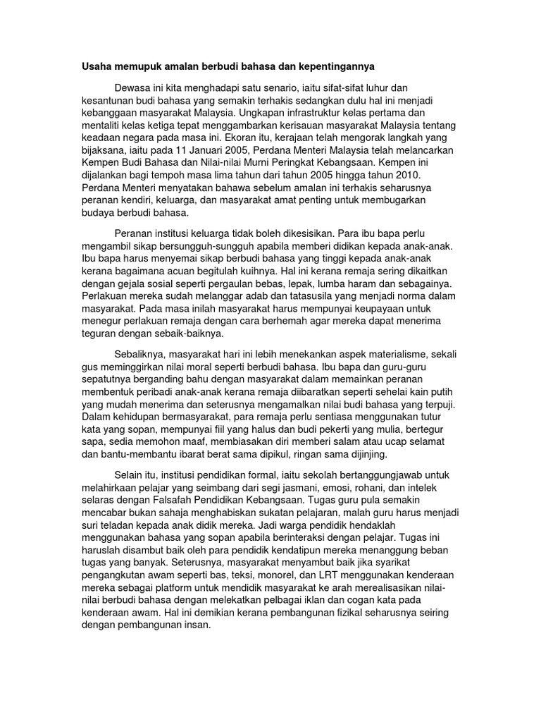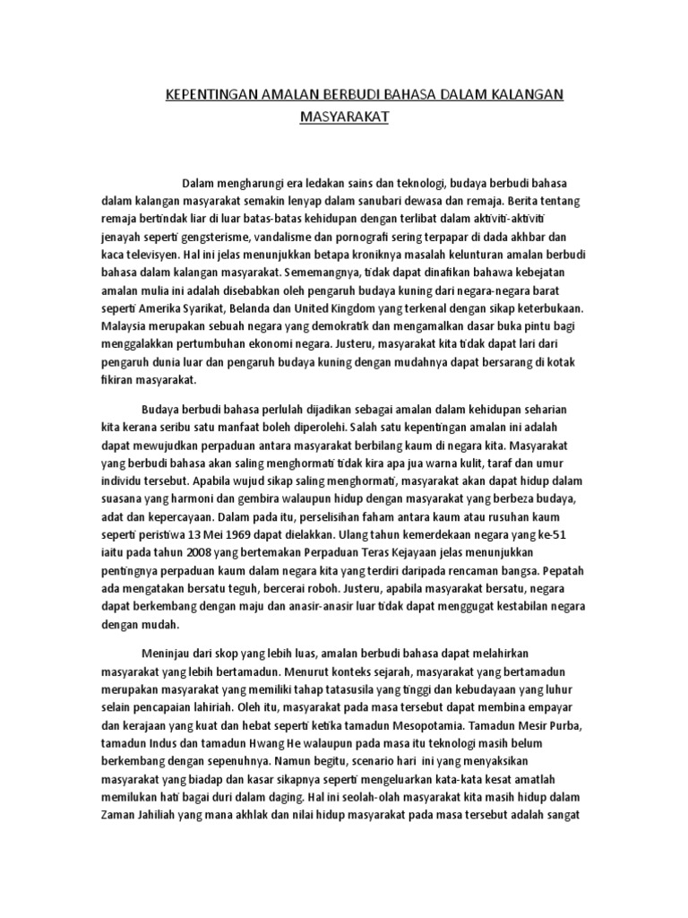 Kepentingan Budi Bahasa Dalam Masyarakat Malaysia Pdf Malaybubu from lh4.googleusercontent.com For more information and source, see on this link : Amalan negatif ini dapat dilihat daripada sikap golongan muda yang semakin tidak menghormati orang tua. Mudah mendapatkan pertolongan ketika berada dalam kesusahan. Pelbagai pihak telah menyuarakan pandangan bahawa masyarakat di negara kita tidak mengamalkan budi bahasa dalam kehidupan bermasyarakat. Bincangkan kepentingan amalan berbudi bahasa dalam masyarakat. Kedudukan istimewa orang melayu kedudukan imam dan jenazah ketika solat jenazah kedatangan portugis ke melaka kedudukan peta kerajaan alam melayu kedudukan bumi bulan dan matahari serta pengaruhnya terhadap kehidupan kedudukan dan peranan institusi raja tahun 5 kedudukan bahasa melayu dalam perlembagaan kedudukan. Etika berasal dari perkataan 'ethos' (greek) yang membawa maksud perangai atau keperibadian. Budi bahasa ialah unsur penting dalam kehidupan orang melayu yang diasaskan daripada tingkah laku dan penggunaan kata kata yang dipilih.