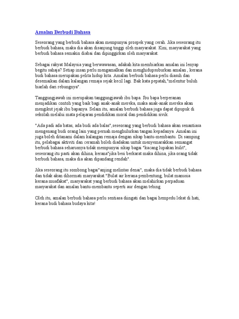 Perkara ini membuktikan bahawa ngo memainkan peranan yang penting dalam mencapai hasrat tersebut. Dari kaca mata yang lain, industri pelancongan juga turut. Akhir sekali, amalan berbudi bahasa dapat menjaga maruah kita terutama bagi seorang muslim. For more information and source, see on this link : Salah satu kepentingan amalan ini ialah amalan ini dapat mewujudkan perpaduan antara masyarakat berbilang kaum di negara kita. Langkah memupuk amalan berbudi bahasa. Tidak rugi berbudi bahasa baik kerana ia menyumbang kepada ganjaran pahala. Melahirkan individu yang beretika dan bersopan santun. Budi bahasa budaya kita maksud. Doc konsep budi bahasa dan kepentingan budi bahasa dalam masyarakat malaysia secara berkesan gsb 1012 amaar hisyam academia edu. Bukan itu sahaja, amalan berbudi bahasa ini akan mendidik masyarakat yang berlainan bangsa dan agama supaya sentiasa menjaga sensitiviti dan perasaan antara satu sama lain sama ada melalui tutur bicara atau perlakuan. Amalan ini boleh mendatangkan banyak kebaikan sekiranya diamalkan oleh segenap lapisan masyarakat. Budi bahasa merupakan elemen penting yang perlu ada dalam diri setiap individu kerana ia melambangkan peribadi dan sahsiah diri seseorang itu.